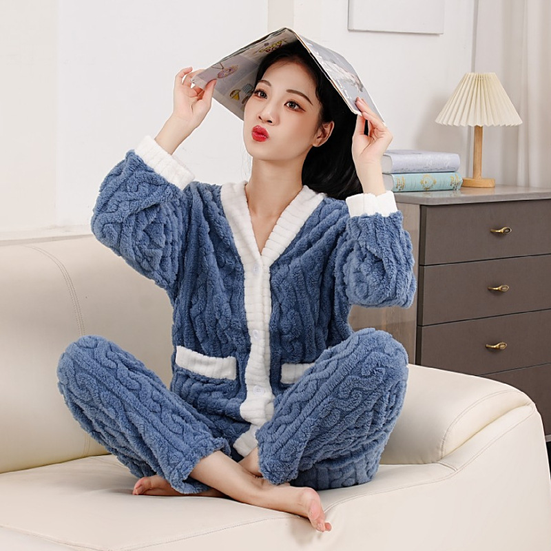 珊瑚絨睡衣套裝,長袖+長褲兩件套,開衫保暖自帶口袋,可居家可外穿,完全不挑身材!誰穿誰好看!